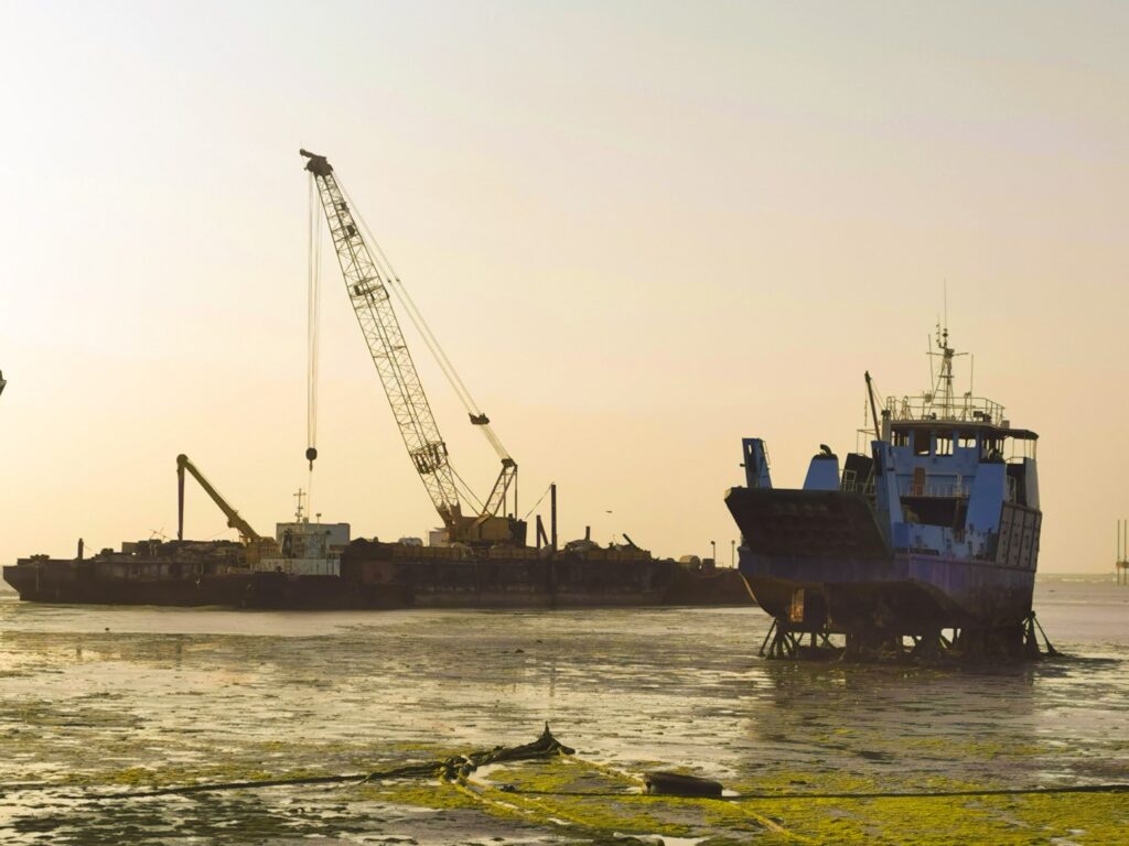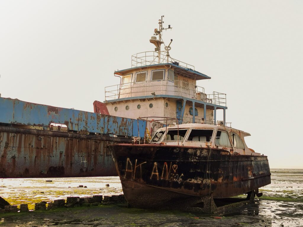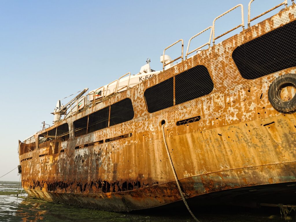 Plus tard, lorsque j’avais travaillé en mer, je regardais mes collègues matelots inlassablement piquer la rouille du ferry sur lequel nous naviguions. Je me figurer son allure lorsqu’il serait un jour, lui aussi, laissé au sort impitoyable du sel et de l’humidité.