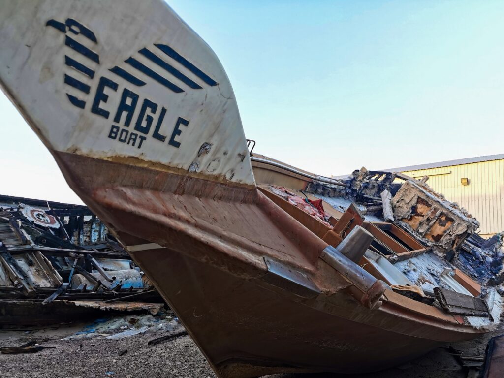 Je décidais de redescendre, et m’éloignais du rivage pour trouver, entre deux hangars, des bateaux à moteur dont certains avaient brûlé.