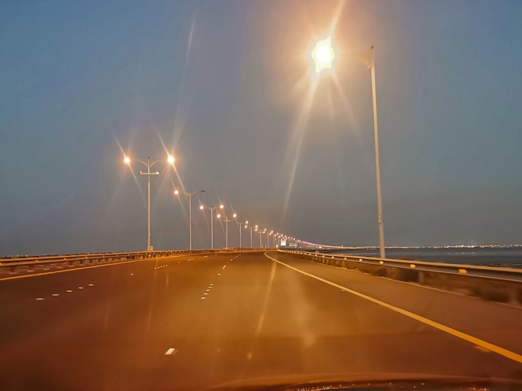 La nuit tombait. J’empreintais l’immense pont Cheikh Jaber al-Ahmad al-Sabah pour rentrer.